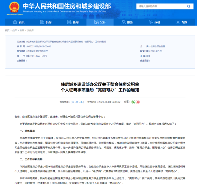 通知提到,2023年8月底前,相關功能在全國住房公積金小程序和全國住房公積金監(jiān)管服務平臺上線運行,“亮碼可辦”推廣使用,原有紙質證明及出具方式并行使用、同時有效,過渡期1年;2024年8月起,全面實行住房公積金個人證明事項“亮碼可辦”。通知還提出精簡整合證明材料、調整證明開具方式、暢通窗口查驗功能、優(yōu)化業(yè)務辦理流程、健全協(xié)同工作機制五項工作任務。
