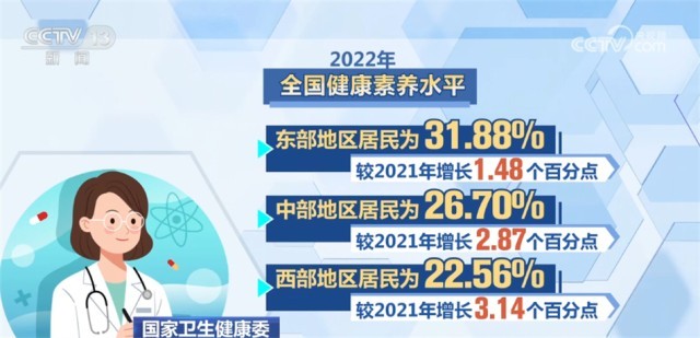 監(jiān)測(cè)結(jié)果顯示,2022年,全國城市居民健康素養(yǎng)水平為31.94%,農(nóng)村居民為23.78%,較2021年分別增長(zhǎng)1.24和1.76個(gè)百分點(diǎn)。東、中、西部地區(qū)居民健康素養(yǎng)水平分別為31.88%、26.70%和22.56%,較2021年分別增長(zhǎng)1.48、2.87和3.14個(gè)百分點(diǎn)。城鄉(xiāng)居民基本知識(shí)和理念素養(yǎng)水平為41.26%,健康生活方式與行為素養(yǎng)水平為30.63%,基本技能素養(yǎng)水平為26.00%,較2021年分別提升3.60、2.58、1.72個(gè)百分點(diǎn)。