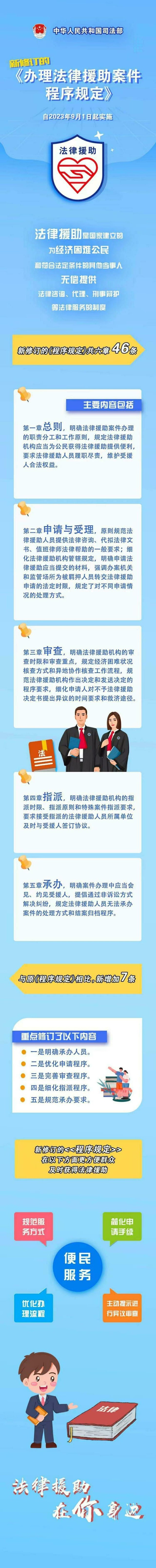 為貫徹落實法律援助法,提高法律援助案件辦理程序的標準化規(guī)范化水平,司法部對2012年公布并施行的《辦理法律援助案件程序規(guī)定》進行了全面修訂,修訂后的《程序規(guī)定》,在方便群眾及時獲得法律援助、提高法律援助服務質(zhì)量等方面,作出了一系列具體規(guī)定。《程序規(guī)定》自2023年9月1日起施行。