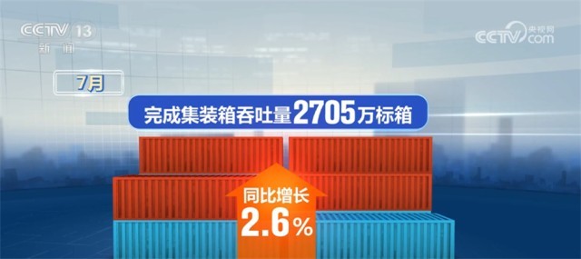 7月,全國港口貨物吞吐量達14.3億噸,同比增長6.6%,其中,內、外貿吞吐量同比分別增長5.8%和8.5%。完成集裝箱吞吐量2705萬標箱,同比增長2.6%。