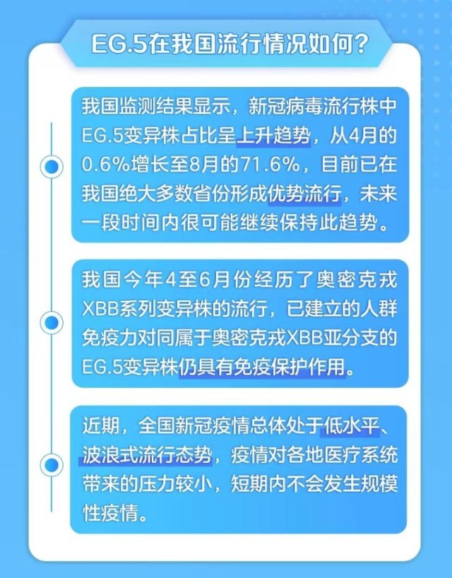 部分公眾關心EG.5是否會引發(fā)新一輪的廣泛流行。對此,國家疾控局表示,我國今年4至6月份經(jīng)歷了奧密克戎XBB系列變異株的流行,已建立的人群免疫力對同屬于奧密克戎XBB亞分支的EG.5變異株仍具有免疫保護作用,短期內不會發(fā)生規(guī)模性疫情。