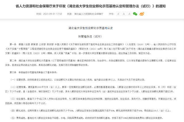 近日,記者從湖北省人力資源和社會保障廳獲悉,為進(jìn)一步推進(jìn)大學(xué)生等重點(diǎn)群體創(chuàng)新創(chuàng)業(yè),湖北省出臺《湖北省大學(xué)生創(chuàng)業(yè)孵化示范基地認(rèn)定和管理辦法(試行)》并于發(fā)文之日開始執(zhí)行。