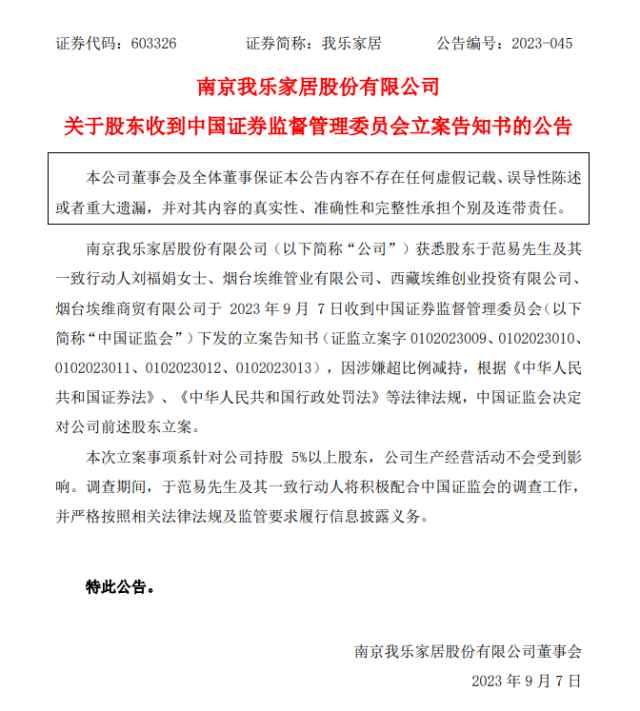 上市公司我樂家居今天(9月7日)公告,因涉嫌超比例減持,根據(jù)《中華人民共和國證券法》、《中華人民共和國行政處罰法》等法律法規(guī),中國證監(jiān)會(huì)決定對公司相關(guān)股東立案。