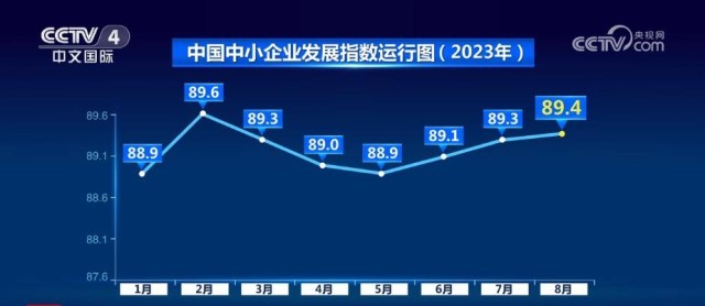 8月,中國中小企業(yè)發(fā)展指數(shù)為89.4,比7月上升0.1點,這是繼6月、7月分別上升0.2點之后,連續(xù)第三個月上升。