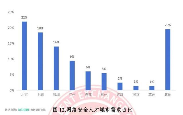 根據(jù)國(guó)家智慧教育公共服務(wù)平臺(tái)數(shù)據(jù),2023年網(wǎng)絡(luò)安全相關(guān)本科專(zhuān)業(yè)(信息安全、網(wǎng)絡(luò)空間安全、網(wǎng)絡(luò)安全與執(zhí)法)畢業(yè)生規(guī)模約為 1.45 萬(wàn)人??傮w上,網(wǎng)絡(luò)安全產(chǎn)業(yè)人才供需關(guān)系為供不應(yīng)求?!秷?bào)告》稱(chēng),根據(jù)拉勾招聘平臺(tái)數(shù)據(jù)顯示,最新網(wǎng)絡(luò)安全人才需求排名前六的城市分別是北京、上海、深圳、廣州、成都和杭州,占據(jù)市場(chǎng)總需求的75%左右。