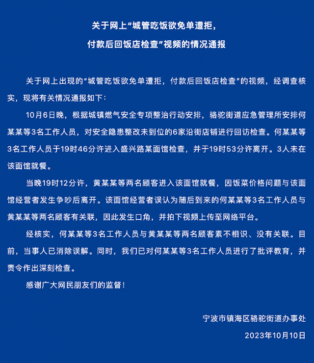 網(wǎng)傳“城管吃飯欲免單遭拒后回飯店檢查”,官方通報