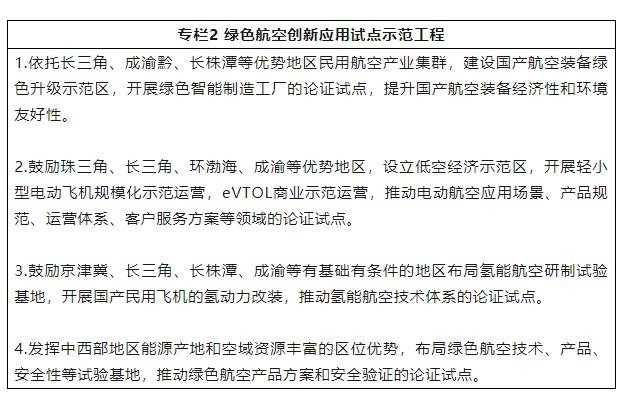 7.推動新能源航空器區(qū)域應(yīng)用試點示范。依托優(yōu)勢地區(qū),建設(shè)國產(chǎn)航空裝備綠色升級示范區(qū)。鼓勵各地區(qū)結(jié)合區(qū)域經(jīng)濟發(fā)展基礎(chǔ)和需求,開展電動通航飛機、eVTOL試點示范應(yīng)用,探索技術(shù)和裝備體系、應(yīng)用場景、商業(yè)運營新模式。鼓勵有基礎(chǔ)有條件的地區(qū)布局綠色航空關(guān)鍵技術(shù)、產(chǎn)品方案、安全驗證等試驗基地。
