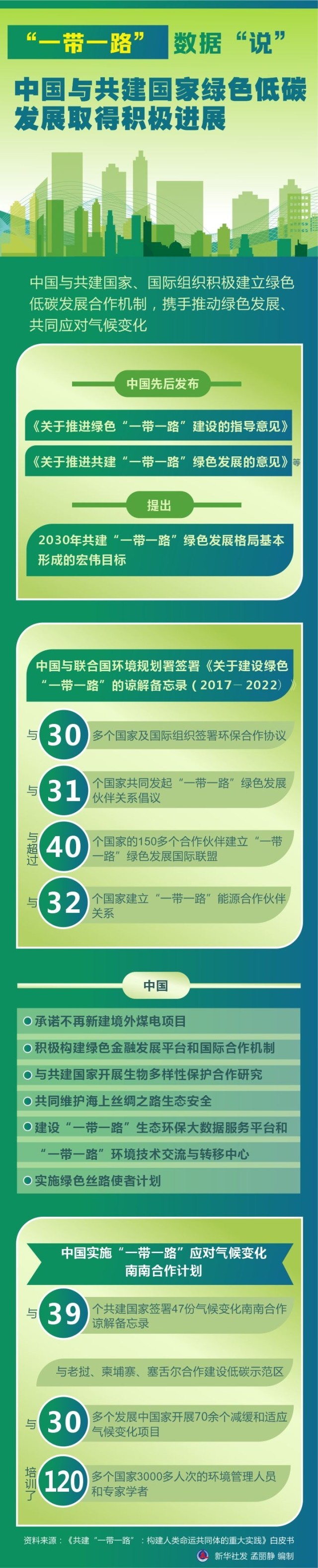 綠色低碳發(fā)展取得積極進(jìn)展。中國(guó)與共建國(guó)家、國(guó)際組織積極建立綠色低碳發(fā)展合作機(jī)制,攜手推動(dòng)綠色發(fā)展、共同應(yīng)對(duì)氣候變化。中國(guó)先后發(fā)布《關(guān)于推進(jìn)綠色“一帶一路”建設(shè)的指導(dǎo)意見》《關(guān)于推進(jìn)共建“一帶一路”綠色發(fā)展的意見》等,提出2030年共建“一帶一路”綠色發(fā)展格局基本形成的宏偉目標(biāo)。