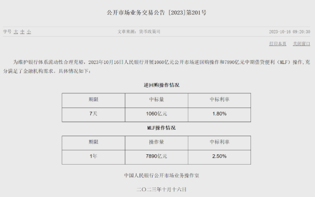 為維護(hù)銀行體系流動(dòng)性合理充裕,10月16日中國(guó)人民銀行開展1060億元公開市場(chǎng)逆回購操作和7890億元中期借貸便利(MLF)操作,充分滿足了金融機(jī)構(gòu)需求。