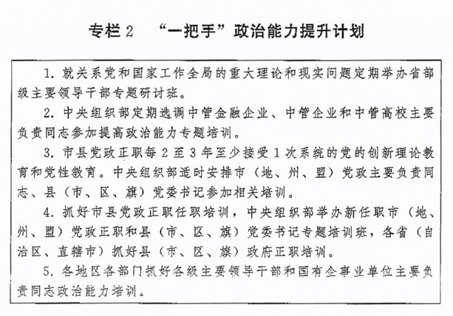 (二)突出“關(guān)鍵少數(shù)”政治訓(xùn)練。堅(jiān)持把政治訓(xùn)練貫穿干部成長全周期,使干部的政治素養(yǎng)、政治能力與擔(dān)負(fù)的領(lǐng)導(dǎo)職責(zé)相匹配。強(qiáng)化“一把手”政治培訓(xùn),有計(jì)劃地選調(diào)地方、部門、國有企事業(yè)單位主要負(fù)責(zé)同志到黨校(行政學(xué)院)、干部學(xué)院參加專題培訓(xùn)。實(shí)施“一把手”政治能力提升計(jì)劃(專欄2)。?。ㄗ灾螀^(qū)、直轄市)、市(地、州、盟)、縣(市、區(qū)、旗)黨政領(lǐng)導(dǎo)班子成員每2至3年到黨校(行政學(xué)院)、干部學(xué)院至少接受1次系統(tǒng)的黨的創(chuàng)新理論教育和黨性教育,5年內(nèi)累計(jì)不少于2個月。圍繞提高政治能力和領(lǐng)導(dǎo)能力,加強(qiáng)機(jī)關(guān)司局長、處長任職培訓(xùn)。重視對女干部、少數(shù)民族干部、黨外干部等的政治培訓(xùn)。加強(qiáng)對高層次人才的政治引領(lǐng),中央組織部會同有關(guān)單位每年組織一定數(shù)量人才開展國情研修。