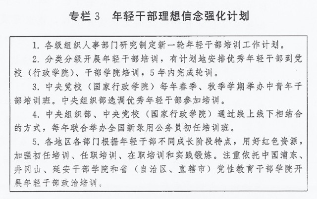 (三)加強(qiáng)年輕干部政治訓(xùn)練。強(qiáng)化習(xí)近平新時代中國特色社會主義思想學(xué)習(xí)教育,突出政治忠誠教育、理想信念教育、紀(jì)律規(guī)矩教育,加強(qiáng)優(yōu)良傳統(tǒng)作風(fēng)和責(zé)任感使命感教育,強(qiáng)化斗爭意識,綜合運(yùn)用理論講授、政策解讀、案例教學(xué)、現(xiàn)場體驗(yàn)等方式開展系統(tǒng)培訓(xùn)。黨委(黨組)負(fù)責(zé)同志要講好“開班第一課”。安排思想政治素質(zhì)過硬、理論水平較高、實(shí)踐經(jīng)驗(yàn)豐富的領(lǐng)導(dǎo)干部上講臺授課。探索推行“政治輔導(dǎo)員”、“導(dǎo)師幫帶”制度。通過開展黨性分析、實(shí)踐鍛煉、過“政治生日”、重溫入黨誓詞等方式,錘煉黨性修養(yǎng)、提高政治覺悟。實(shí)施年輕干部理想信念強(qiáng)化計(jì)劃(專欄3)。