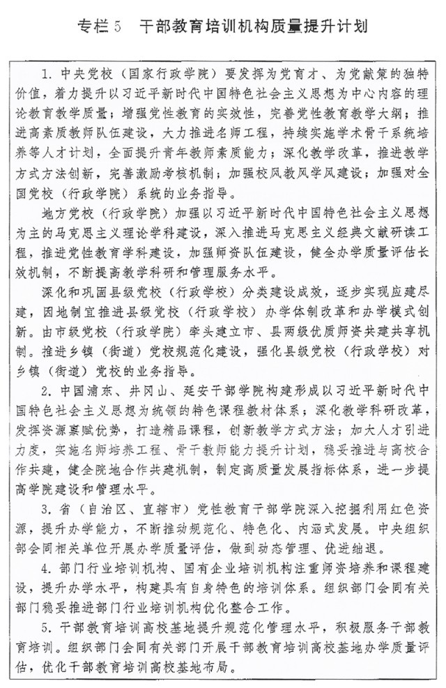 ?。ǘ┩貙捙嘤?xùn)渠道。根據(jù)黨政領(lǐng)導(dǎo)干部、國有企事業(yè)單位領(lǐng)導(dǎo)人員和機(jī)關(guān)公務(wù)員、年輕干部、基層干部、專業(yè)技術(shù)人員等不同對象特點(diǎn),整合優(yōu)質(zhì)資源,多渠道多方面開展履職能力培訓(xùn)。發(fā)揮各級黨校(行政學(xué)院)、干部學(xué)院主體作用,圍繞黨中央重大決策部署和國家重大戰(zhàn)略需求、地方黨委和政府中心工作開展專題培訓(xùn);發(fā)揮部門行業(yè)培訓(xùn)機(jī)構(gòu)特色優(yōu)勢,開展專門政策解讀、重點(diǎn)任務(wù)落實(shí)等專題培訓(xùn);發(fā)揮國有企業(yè)培訓(xùn)機(jī)構(gòu)作用,開展國有企業(yè)領(lǐng)導(dǎo)人員治企興企、提高企業(yè)核心競爭力、強(qiáng)化企業(yè)科技創(chuàng)新主體地位等專題培訓(xùn);發(fā)揮干部教育培訓(xùn)高?;貙W(xué)科專業(yè)優(yōu)勢,開展新知識新技能等培訓(xùn);發(fā)揮基層干部教育培訓(xùn)機(jī)構(gòu)特色優(yōu)勢,開展基層干部實(shí)務(wù)培訓(xùn);發(fā)揮專業(yè)技術(shù)人員繼續(xù)教育基地資源優(yōu)勢,開展專業(yè)技術(shù)能力提升培訓(xùn);發(fā)揮職業(yè)學(xué)校(含技工院校)培養(yǎng)高技能人才的基礎(chǔ)性作用,開展技術(shù)技能培訓(xùn);發(fā)揮中國干部網(wǎng)絡(luò)學(xué)院等網(wǎng)絡(luò)學(xué)習(xí)平臺廣覆蓋、便捷化的優(yōu)勢,抓好履職通識培訓(xùn);發(fā)揮派出單位和接收單位協(xié)作優(yōu)勢,抓好援派幫扶干部人才、掛職干部等教育培訓(xùn)。積極創(chuàng)造條件,支持干部在職自學(xué)。實(shí)施干部履職能力提升計(jì)劃(專欄4)。