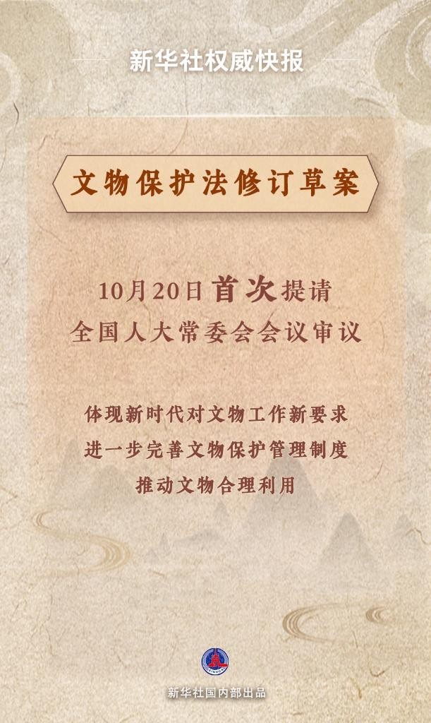 10月20日,文物保護法修訂草案提請十四屆全國人大常委會第六次會議首次審議。修訂草案貫徹黨中央決策部署,體現(xiàn)新時代對文物工作新要求;堅持把保護放在第一位,進一步完善文物保護管理制度;妥善處理保護和利用的關(guān)系,推動文物合理利用;多措并舉加大處罰力度,嚴厲打擊破壞文物違法行為。