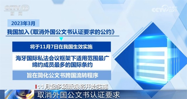 今年3月,我國(guó)加入《取消外國(guó)公文書認(rèn)證要求的公約》,《公約》將于11月7日在我國(guó)生效實(shí)施?!豆s》是海牙國(guó)際私法會(huì)議框架下適用范圍最廣、締約成員最多的國(guó)際條約,旨在簡(jiǎn)化公文書跨國(guó)流轉(zhuǎn)程序。11月7日起,中國(guó)送往其他締約國(guó)使用的公文書僅需辦理《公約》規(guī)定的附加證明書,即可送其他締約國(guó)使用,無(wú)需辦理中國(guó)和締約國(guó)駐華使領(lǐng)館的領(lǐng)事認(rèn)證。其他締約國(guó)公文書送中國(guó)內(nèi)地使用,只需辦理該國(guó)附加證明書,無(wú)需辦理該國(guó)和中國(guó)駐當(dāng)?shù)厥诡I(lǐng)館的領(lǐng)事認(rèn)證。