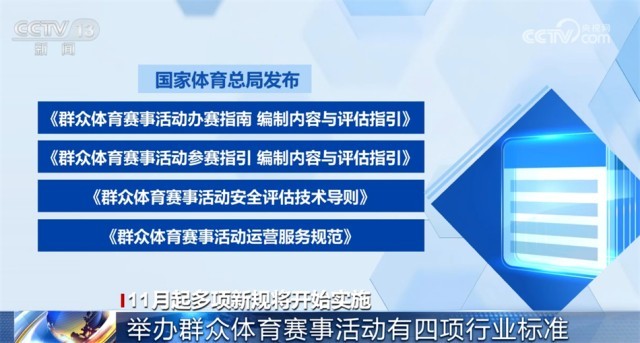 國(guó)家體育總局發(fā)布的《群眾體育賽事活動(dòng)辦賽指南 編制內(nèi)容與評(píng)估指引》《群眾體育賽事活動(dòng)參賽指引 編制內(nèi)容與評(píng)估指引》《群眾體育賽事活動(dòng)安全評(píng)估技術(shù)導(dǎo)則》《群眾體育賽事活動(dòng)運(yùn)營(yíng)服務(wù)規(guī)范》四項(xiàng)體育行業(yè)標(biāo)準(zhǔn)自11月1日起實(shí)施。這些標(biāo)準(zhǔn)明確了群眾體育賽事活動(dòng)安全評(píng)估的流程、策劃、實(shí)施和總結(jié),運(yùn)營(yíng)服務(wù)的基本要求、服務(wù)要求、管理要求等內(nèi)容,適用于各級(jí)各類群眾體育賽事活動(dòng)的舉辦。