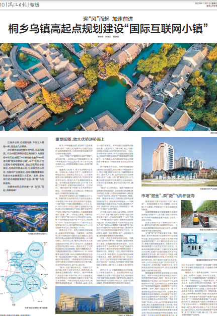 11月1日,《浙江日報(bào)》整版刊發(fā)《迎“風(fēng)”而起 加速前進(jìn)桐鄉(xiāng)烏鎮(zhèn)高起點(diǎn)規(guī)劃建設(shè)“國際互聯(lián)網(wǎng)小鎮(zhèn)”》,全文如下: