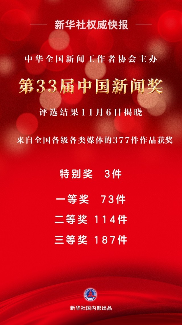 由中華全國新聞工作者協(xié)會主辦的第33屆中國新聞獎評選結果11月6日揭曉。