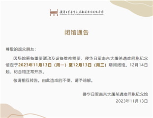 記者從侵華日軍南京大屠殺遇難同胞紀(jì)念館了解到,因場(chǎng)館籌備重要活動(dòng)及設(shè)備維修需要,該館定于2023年11月13日(周一)至12月13日(周三)期間閉館,12月14日起正常開放。