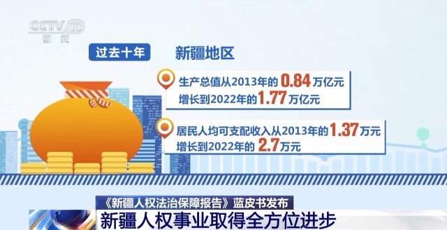 會(huì)議期間,還舉行了《新疆人權(quán)法治保障報(bào)告》藍(lán)皮書(shū)揭幕儀式。過(guò)去十年,新疆地區(qū)生產(chǎn)總值從2013年的0.84萬(wàn)億元增長(zhǎng)到2022年的1.77萬(wàn)億元,居民人均可支配收入從2013年的1.37萬(wàn)元增長(zhǎng)到2022年的2.7萬(wàn)元。