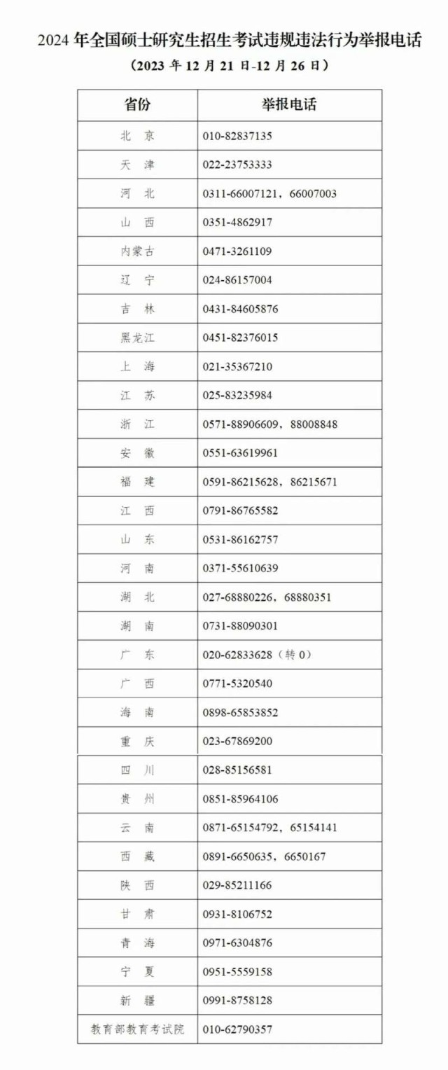 教育部和各省(區(qū)、市)教育招生考試機(jī)構(gòu)將開通2024年研考舉報電話,考生及社會各界人士可及時舉報反映有關(guān)問題線索。教育部及各?。▍^(qū)、市)將會同有關(guān)部門根據(jù)舉報線索第一時間核查處理,堅決維護(hù)風(fēng)清氣正的研考環(huán)境。