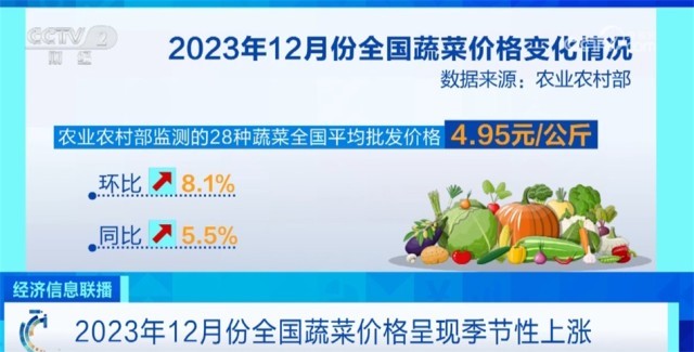 央視網(wǎng)消息:來關(guān)注“菜籃子”價格。農(nóng)業(yè)農(nóng)村部最新數(shù)據(jù)顯示,2023年12月份全國菜籃子指數(shù)為123.32,環(huán)比上漲6.89個點(diǎn),蔬菜價格呈現(xiàn)季節(jié)性上漲。