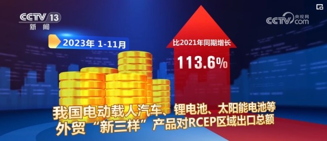 2023年1—11月,中國(guó)對(duì)RCEP成員國(guó)的中間品出口,比2021年同期增長(zhǎng)17.4%,中國(guó)成為區(qū)域內(nèi)最大的中間品貿(mào)易國(guó)。2023年1—11月,我國(guó)電動(dòng)載人汽車、鋰電池、太陽(yáng)能電池等外貿(mào)“新三樣”產(chǎn)品對(duì)RCEP區(qū)域出口總額,比2021年同期增長(zhǎng)113.6%。