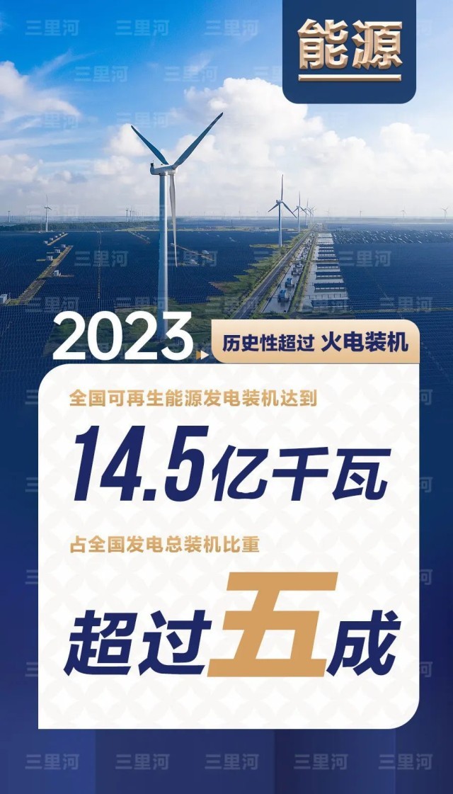 2023年,全國可再生能源發(fā)電裝機達(dá)到14.5億千瓦,占全國發(fā)電總裝機比重超過五成,歷史性超過火電裝機。