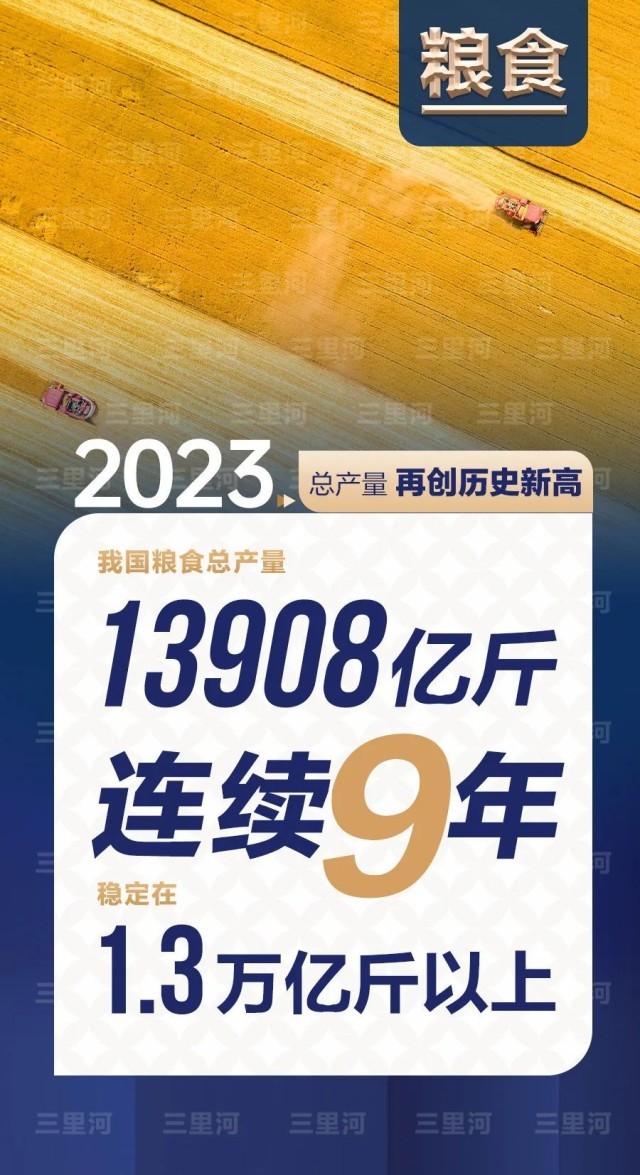 2023年,中國糧食產(chǎn)量再創(chuàng)歷史新高,連續(xù)9年穩(wěn)定在1.3萬億斤以上。