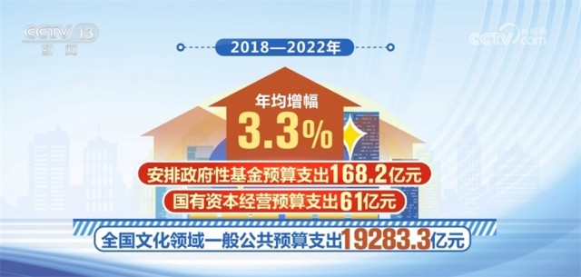 2018—2022年,全國文化領域一般公共預算支出19283.3億元,年均增幅3.3%;安排政府性基金預算支出168.2億元,國有資本經營預算支出61億元。