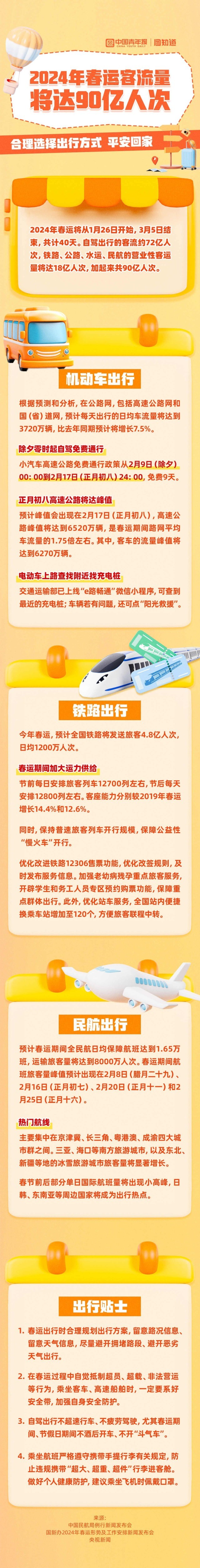 2024年春運(yùn)將從1月26日開始,全社會(huì)跨區(qū)域人員流動(dòng)量將創(chuàng)歷史新高。春運(yùn)期間:①除夕零時(shí)起自駕免費(fèi)通行;②鐵路全國(guó)站內(nèi)便捷換乘車站增加至120個(gè);③民航國(guó)內(nèi)熱門航線集中在京津冀、長(zhǎng)三角、粵港澳、成渝四大城市群之間。你會(huì)選擇那種方式回家過年?點(diǎn)擊長(zhǎng)圖,一起了解春運(yùn)出行保障。