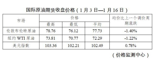 據(jù)國(guó)家發(fā)展改革委價(jià)格監(jiān)測(cè)中心監(jiān)測(cè),本輪成品油調(diào)價(jià)周期內(nèi)(1月3日-1月16日)國(guó)際油價(jià)在震蕩中小幅下降。平均來(lái)看,倫敦布倫特、紐約WTI油價(jià)比上輪調(diào)價(jià)周期下跌1.31%。