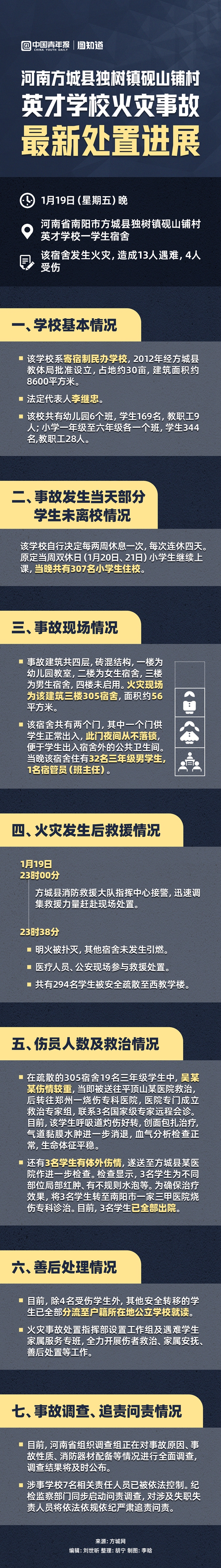 1月19日晚,河南省方城縣獨樹鎮(zhèn)硯山鋪村英才學校一宿舍發(fā)生火災,事故造成13人遇難,4人受傷。1月23日,方城縣通報了部分事故情況:當晚有307名小學生住校,火災現(xiàn)場為宿舍樓三樓305宿舍,面積56平方米;當晚該宿舍住有32名三年級男學生,1名宿管員(班主任);涉事學校7名相關責任人員已被依法控制。