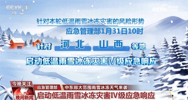 針對(duì)本輪低溫雨雪冰凍災(zāi)害的風(fēng)險(xiǎn)形勢(shì),應(yīng)急管理部1月31日10時(shí),針對(duì)河北、山西等地啟動(dòng)低溫雨雪冰凍災(zāi)害Ⅳ級(jí)應(yīng)急響應(yīng)。同時(shí),國(guó)家防災(zāi)減災(zāi)救災(zāi)委員會(huì)辦公室、應(yīng)急管理部等部門派出2個(gè)工作組分赴河南和湖北,協(xié)助指導(dǎo)低溫雨雪冰凍災(zāi)害防范應(yīng)對(duì)工作。中國(guó)氣象局1月31日上午啟動(dòng)重大氣象災(zāi)害(雨雪冰凍)Ⅲ級(jí)應(yīng)急響應(yīng)。