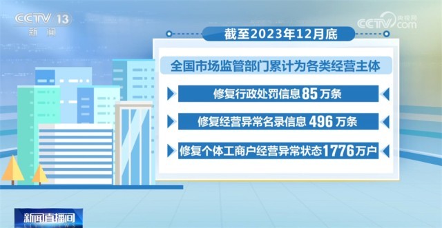 截至2023年12月底,全國(guó)市場(chǎng)監(jiān)管部門累計(jì)為各類經(jīng)營(yíng)主體修復(fù)行政處罰信息85萬(wàn)條,修復(fù)經(jīng)營(yíng)異常名錄信息496萬(wàn)條,修復(fù)個(gè)體工商戶經(jīng)營(yíng)異常狀態(tài)1776萬(wàn)戶。