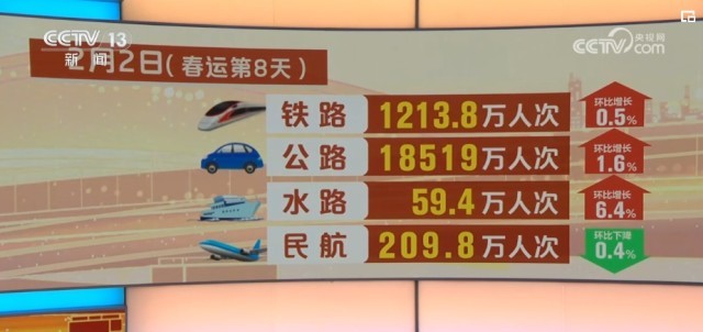 具體來(lái)看,2月2日,鐵路客運(yùn)量1213.8萬(wàn)人次,環(huán)比增長(zhǎng)0.5%;公路人員流動(dòng)量18519萬(wàn)人次,環(huán)比增長(zhǎng)1.6%;水路客運(yùn)量59.4萬(wàn)人次,環(huán)比增長(zhǎng)6.4%;民航客運(yùn)量209.8萬(wàn)人次,環(huán)比下降0.4%。