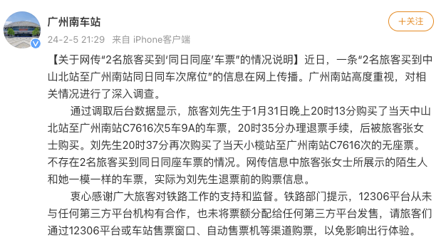 2名旅客買到“同日同車次席位”?廣州南站回應