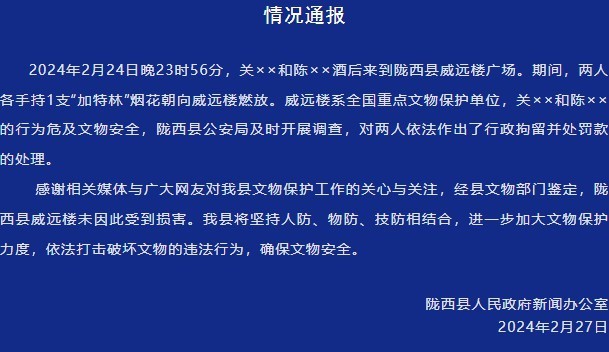 2024年2月24日晚23時56分,關××和陳××酒后來到隴西縣威遠樓廣場。期間,兩人各手持1支“加特林”煙花朝向威遠樓燃放。威遠樓系全國重點文物保護單位,關××和陳××的行為危及文物安全,隴西縣公安局及時開展調(diào)查,對兩人依法作出了行政拘留并處罰款的處理。