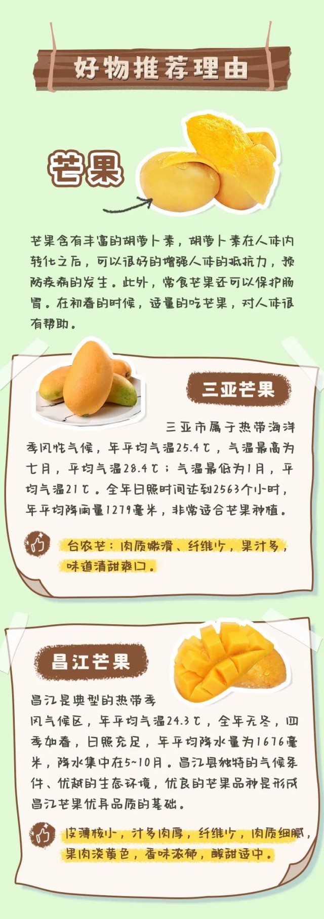 金黃色的外皮,鮮嫩的果肉,香甜的汁水,讓芒果備受人們喜愛。芒果原產(chǎn)印度和馬來西亞,據(jù)考證,芒果是被唐代的玄奘法師帶回中國(guó)的。在《大唐西域記》中記載“庵波羅果,見珍于世”。如今,我國(guó)的臺(tái)灣、廣東、廣西、海南、福建及云南等地都有芒果種植。