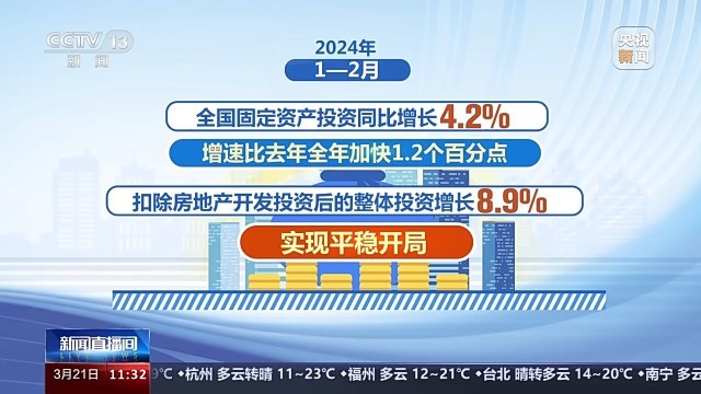 國家發(fā)展和改革委員會副主任劉蘇社介紹,今年以來,國家發(fā)展改革委會同有關(guān)方面,充分發(fā)揮政府投資的帶動放大效應(yīng),積極支持社會資本參與重大項目建設(shè),著力擴(kuò)大有效益的投資。1—2月,全國固定資產(chǎn)投資同比增長4.2%,增速比去年全年加快1.2個百分點;扣除房地產(chǎn)開發(fā)投資后的整體投資增長8.9%,實現(xiàn)平穩(wěn)開局。