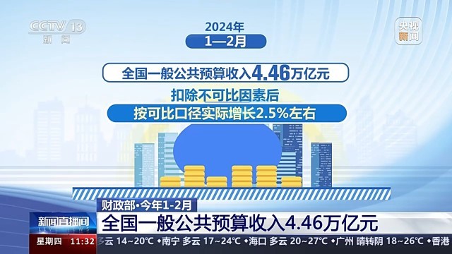 財政部副部長廖岷介紹,今年1—2月,全國一般公共預(yù)算收入4.46萬億元,扣除不可比因素后,按可比口徑實際增長2.5%左右,保持恢復(fù)性增長,與宏觀經(jīng)濟(jì)穩(wěn)中向好的態(tài)勢基本保持一致;全國一般公共預(yù)算支出同比增長6.7%,完成全年預(yù)算的15.3%,支出進(jìn)度為近5年同期最快。