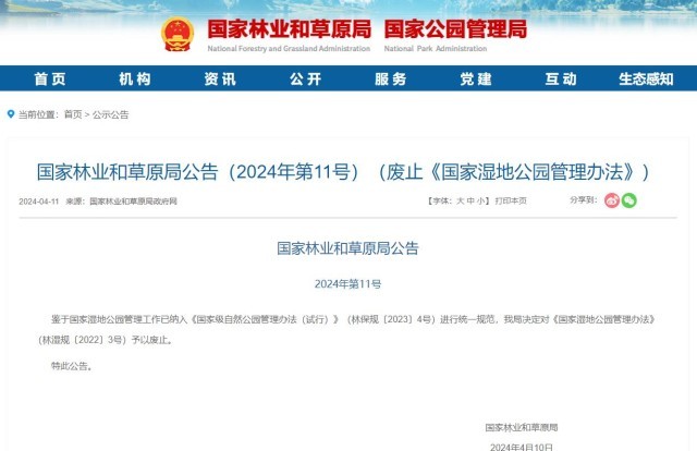 央視網(wǎng)消息:國家林業(yè)和草原局發(fā)布公告2024年第11號,鑒于國家濕地公園管理工作已納入《國家級自然公園管理辦法(試行)》(林保規(guī)〔2023〕4號)進行統(tǒng)一規(guī)范,決定對《國家濕地公園管理辦法》(林濕規(guī)〔2022〕3號)予以廢止。