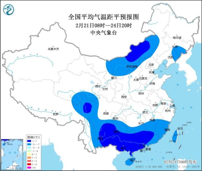 受持續(xù)陰雨雪和冷空氣共同影響,我國南方大部地區(qū)氣溫將顯著偏低。預計21日08時至24日20時,貴州、四川西部和南部、湖南南部、江西中南部、云南東部、廣西、廣東、福建、海南和臺灣島等地的日平均氣溫較歷史同期偏低5℃以上,其中,云南東部、貴州南部、湖南南部、江西南部、廣西大部、廣東中西部等地偏低7℃以上,最低氣溫0℃線將壓至貴州南部、湖南南部、江西北部到浙江南部一帶,4℃線將壓至廣西中部到廣東中部一帶。另外,內(nèi)蒙古中部、吉林、青藏高原東部等地日平均氣溫也較歷史同期偏低5℃,部分地區(qū)偏低7℃。(見圖1、圖2)。