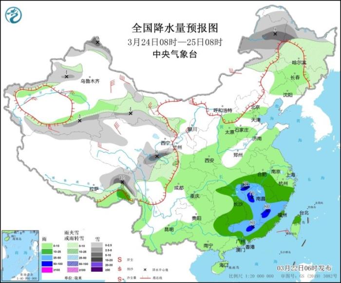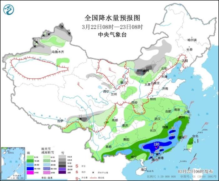 3月22日08時(shí)至23日08時(shí),內(nèi)蒙古中東部、新疆北部、西藏東部、甘肅中部、陜西北部和東南部、山西北部、河北西北部、北京西北部、遼寧西部等地部分地區(qū)有小到中雪或雨夾雪,其中,新疆北疆北部和伊犁河谷、西藏東北部、內(nèi)蒙古中部、山西北部等地部分地區(qū)有大到暴雪(10~15毫米)。江南中東部和南部、云南東南部、華南大部、臺(tái)灣島等地部分地區(qū)有中到大雨,其中,江西南部、福建西部、廣西東北部、廣東中北部及西部沿海等地局部地區(qū)有暴雨或大暴雨(100~120毫米)。內(nèi)蒙古西北部、青海北部、江南南部、華南北部等地部分地區(qū)有4~5級(jí)風(fēng)(見(jiàn)圖2)。