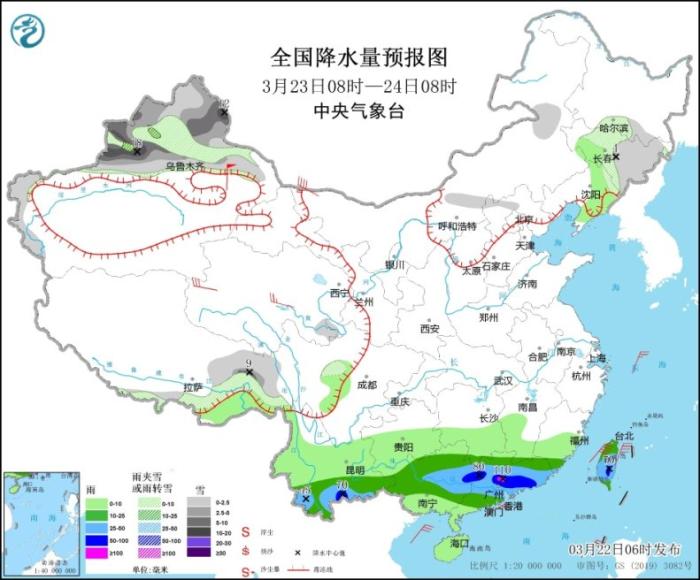 3月23日08時(shí)至24日08時(shí),新疆北部和西部山區(qū)、吉林中東部、西藏東北部等地部分地區(qū)有小到中雪或雨夾雪,其中,新疆北疆東部和伊犁河谷部分地區(qū)有大到暴雪(10~18毫米)。云南南部、華南、臺(tái)灣島等地部分地區(qū)有中到大雨,其中,云南東南部、廣西東部、廣東中部和東部、臺(tái)灣島中南部等地部分地區(qū)有暴雨或大暴雨(100~110毫米)。內(nèi)蒙古西部、青海、新疆東部等地部分地區(qū)有4~6級(jí)風(fēng),其中,新疆東部部分地區(qū)有7~8級(jí)風(fēng)(見(jiàn)圖3)。