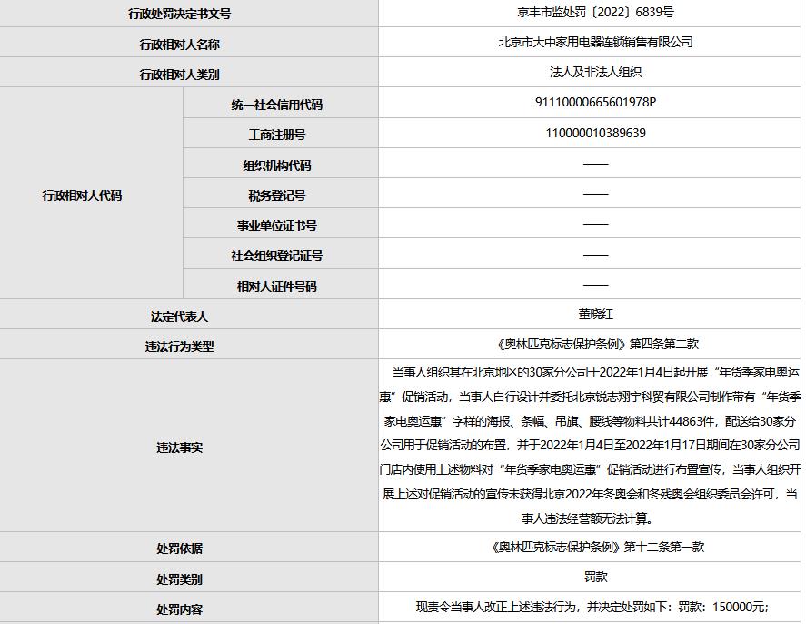 行政處罰書顯示,當(dāng)事人自行設(shè)計并委托北京銳志翔宇科貿(mào)有限公司制作帶有“年貨季家電奧運惠”字樣的海報、條幅、吊旗、腰線等物料共計44863件,配送給30家分公司用于促銷活動的布置,并于2022年1月4日至2022年1月17日期間在30家分公司門店內(nèi)使用上述物料對“年貨季家電奧運惠”促銷活動進(jìn)行布置宣傳,當(dāng)事人組織開展上述對促銷活動的宣傳未獲得北京2022年冬奧會和冬殘奧會組織委員會許可,當(dāng)事人違法經(jīng)營額無法計算。(完)