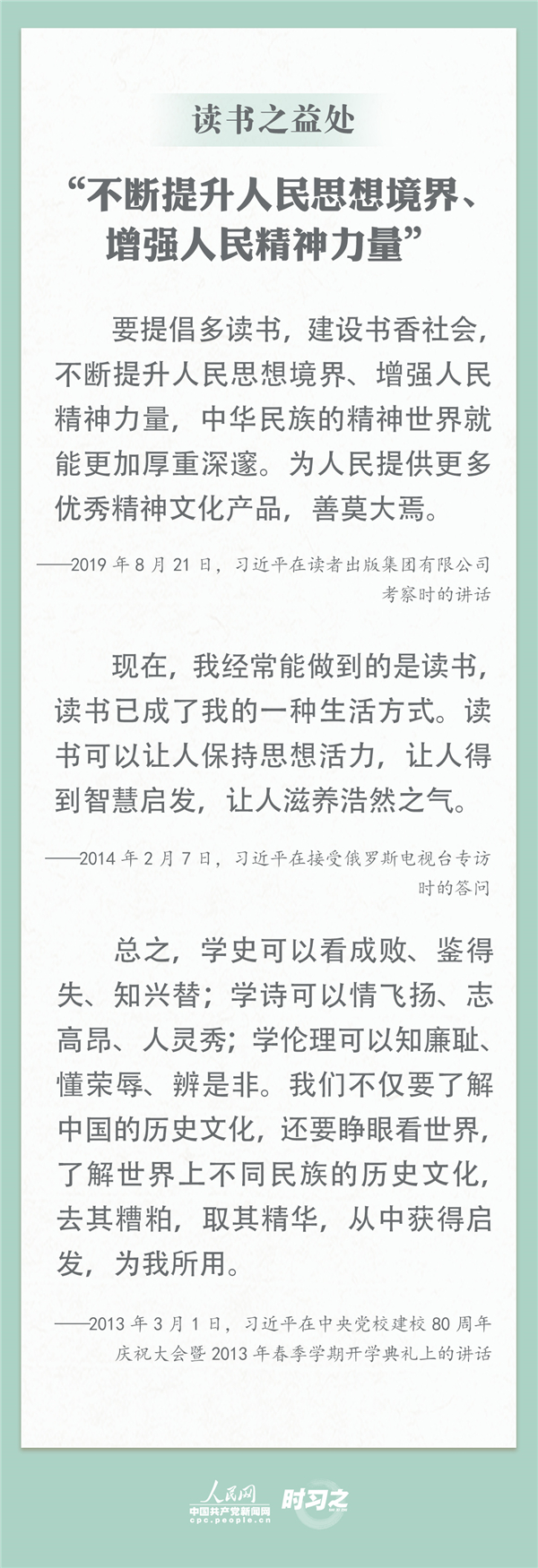 讀書滋養(yǎng)美好心靈。習(xí)近平總書記曾多次談及讀書的好處,“人民群眾多讀書,我們的民族精神就會(huì)厚重起來(lái)、深邃起來(lái)” 。4月23日是世界讀書日,跟習(xí)近平總書記學(xué)讀書之道,讓學(xué)習(xí)點(diǎn)亮生活,讓全民閱讀蔚然成風(fēng)。