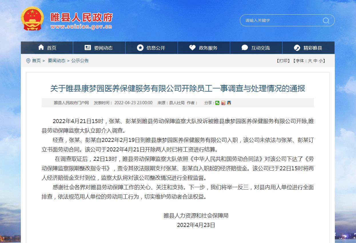 通報(bào)稱,4月21日15時(shí),張某、彭某到睢縣勞動(dòng)保障監(jiān)察大隊(duì)投訴被睢縣康夢園醫(yī)養(yǎng)保健服務(wù)有限公司開除,睢縣勞動(dòng)保障監(jiān)察大隊(duì)立即介入調(diào)查。