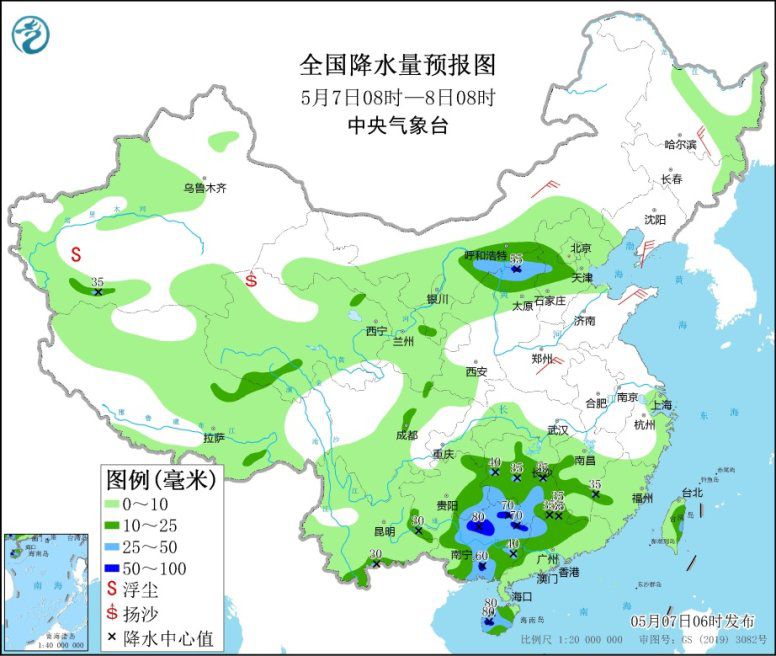 5月7日08時(shí)至8日08時(shí),內(nèi)蒙古河套地區(qū)、陜西北部、山西北部、河北西部、重慶東南部、貴州東部和南部、云南東部和南部、湖南中南部、江西南部、廣西、廣東北部和西部、海南島等地的部分地區(qū)有中到大雨,其中,山西北部、廣西北部和東南部、海南島中西部等地局地暴雨(50~90毫米)。內(nèi)蒙古、西北地區(qū)東部、東北地區(qū)北部和南部、華北北部和西部、黃淮大部、江南東部、西藏中北部等地的部分地區(qū)有4~6級(jí)風(fēng)(見圖1);渤海、渤海海峽有6~7級(jí)、陣風(fēng)8級(jí)的偏北風(fēng)。