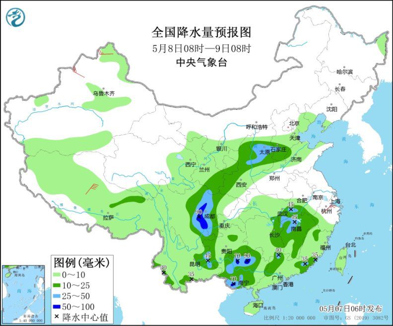 5月8日08時(shí)至9日08時(shí),甘肅南部、陜西北部和西南部、山西中部、河北南部、四川盆地西部、貴州西部和南部、云南東部和南部、湖北東南部、江西、湖南東部和南部、廣西、廣東北部、福建南部等地的部分地區(qū)有中到大雨,其中,四川盆地西部和南部、廣西北部和南部等地局地暴雨(50~90毫米)。新疆北部、江南東部、西藏中北部等地的部分地區(qū)有4~6級(jí)風(fēng)(見圖2)。