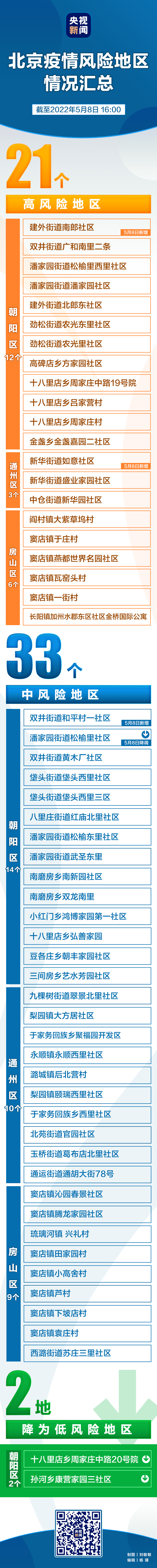 截至2022年5月7日24時(shí),朝陽區(qū)十八里店鄉(xiāng)周家莊中路20號(hào)院、孫河鄉(xiāng)康營(yíng)家園三社區(qū)近14天各累計(jì)報(bào)告1例本土確診病例。經(jīng)北京市疾控中心評(píng)估,按照《北京市新冠肺炎疫情風(fēng)險(xiǎn)分級(jí)標(biāo)準(zhǔn)》,即日起將朝陽區(qū)十八里店鄉(xiāng)周家莊中路20號(hào)院、孫河鄉(xiāng)康營(yíng)家園三社區(qū)由中風(fēng)險(xiǎn)地區(qū)降為低風(fēng)險(xiǎn)地區(qū)。